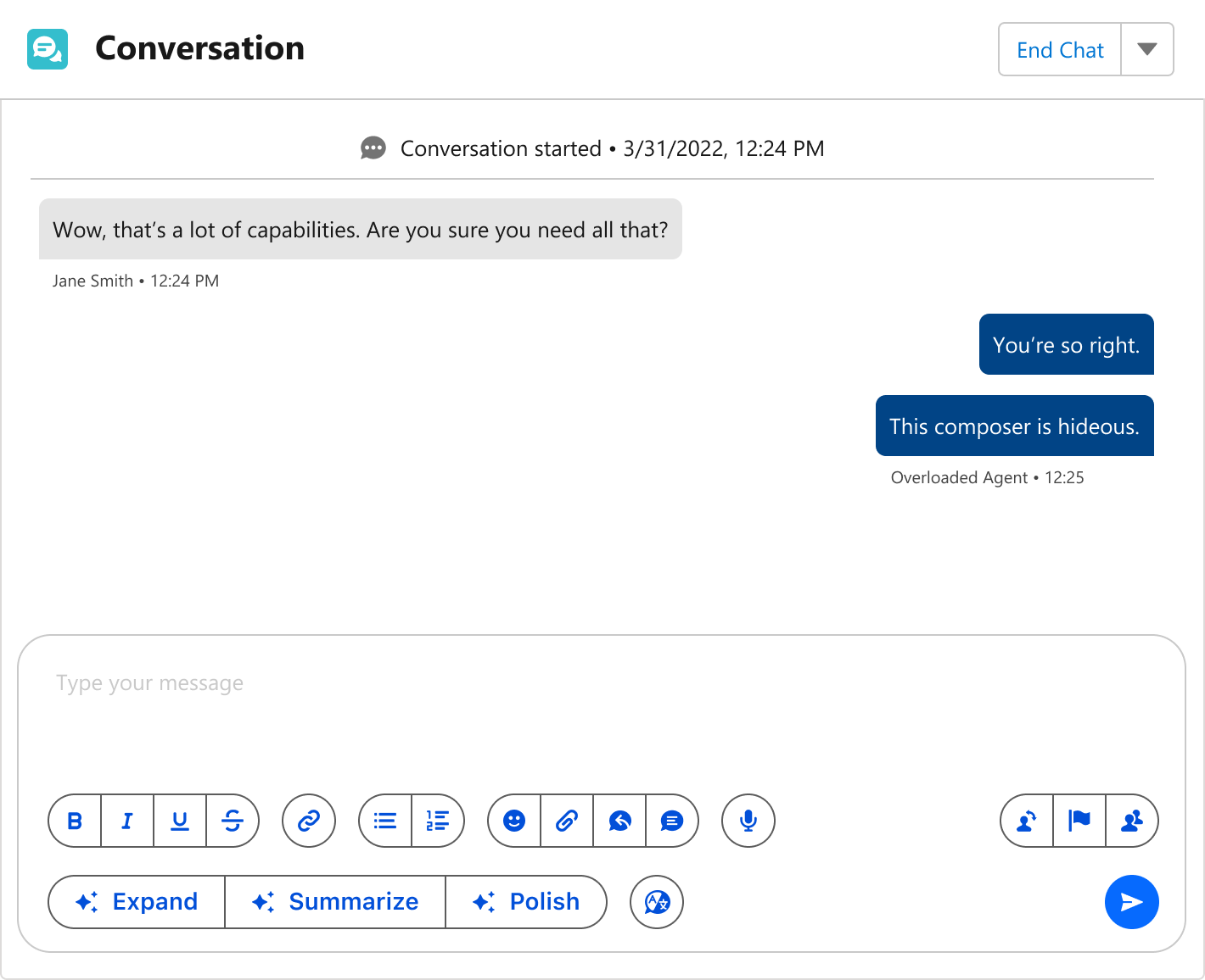 With a UI as vital as this composer, sneezing buttons all over the place wasn’t going to cut it. Service Agents are busy enough that they shouldn’t have to scan for what to click among a mass of options.